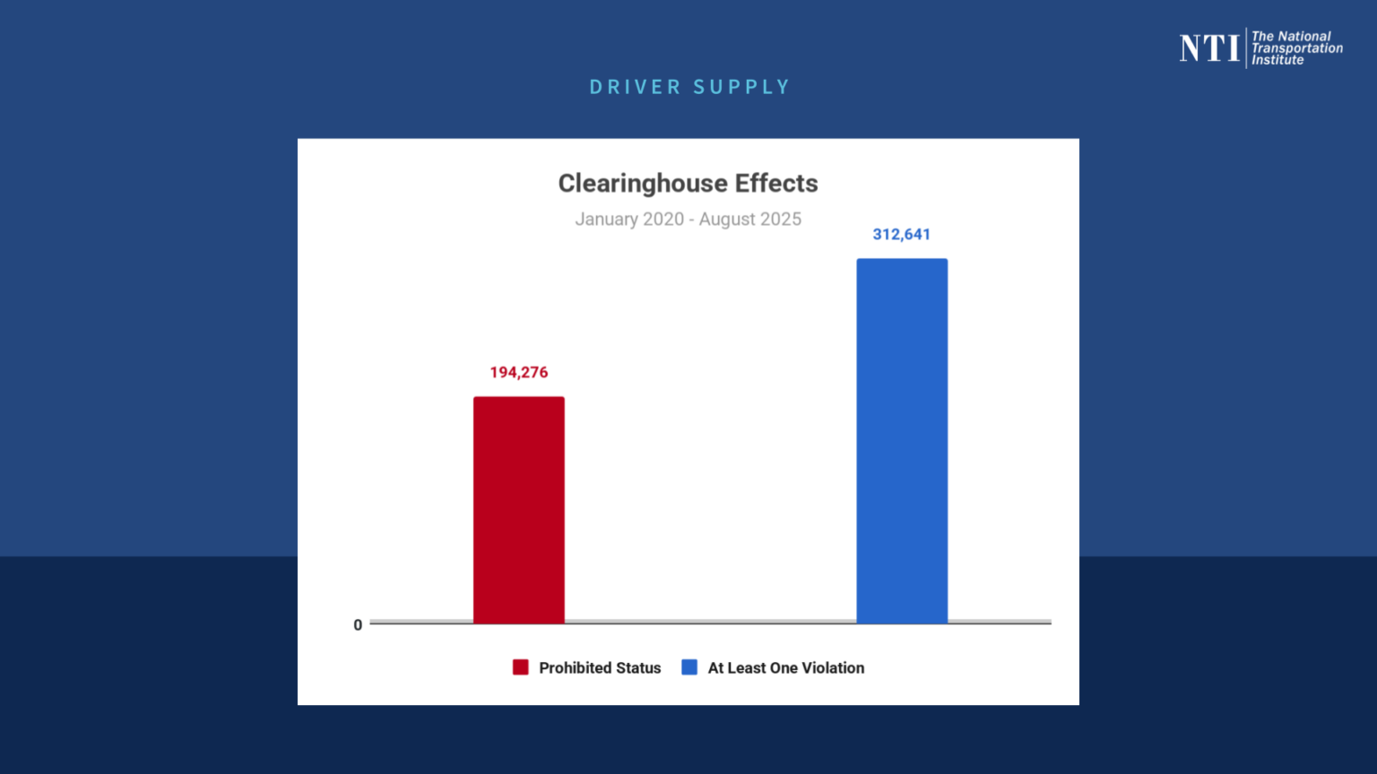 NTI has been documenting the impact of the CDL Drug & Alcohol Clearinghouse for nearly six years, since its inception in January 2020. On average, 5,000 drivers a month are flagged for violations and sent to prohibited status, with nearly 315,000 drivers having received a violation from January 2020 through August 2025.