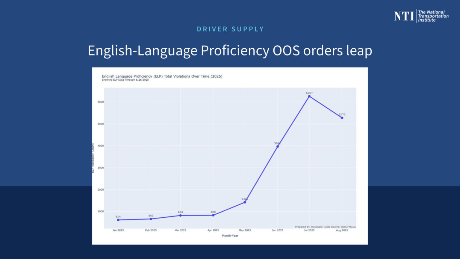 As it relates to driver supply, out-of-service orders associated with ELPs are already having an impact, with more than 11,500 drivers placed out of service in the first two months of enforcement. At that pace, tens of thousands of drivers will be removed by year’s end.