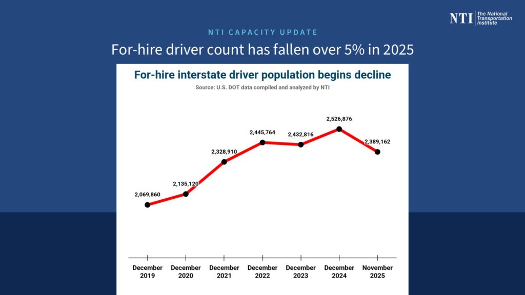 While regulatory shifts around non-domiciled CDLs and English-Language Proficiency have been peeling away available workforce from trucking, industry capacity was already shrinking, including fleet exits and a noteworthy drop in the for-hire driver population in 2025 (over 5%):