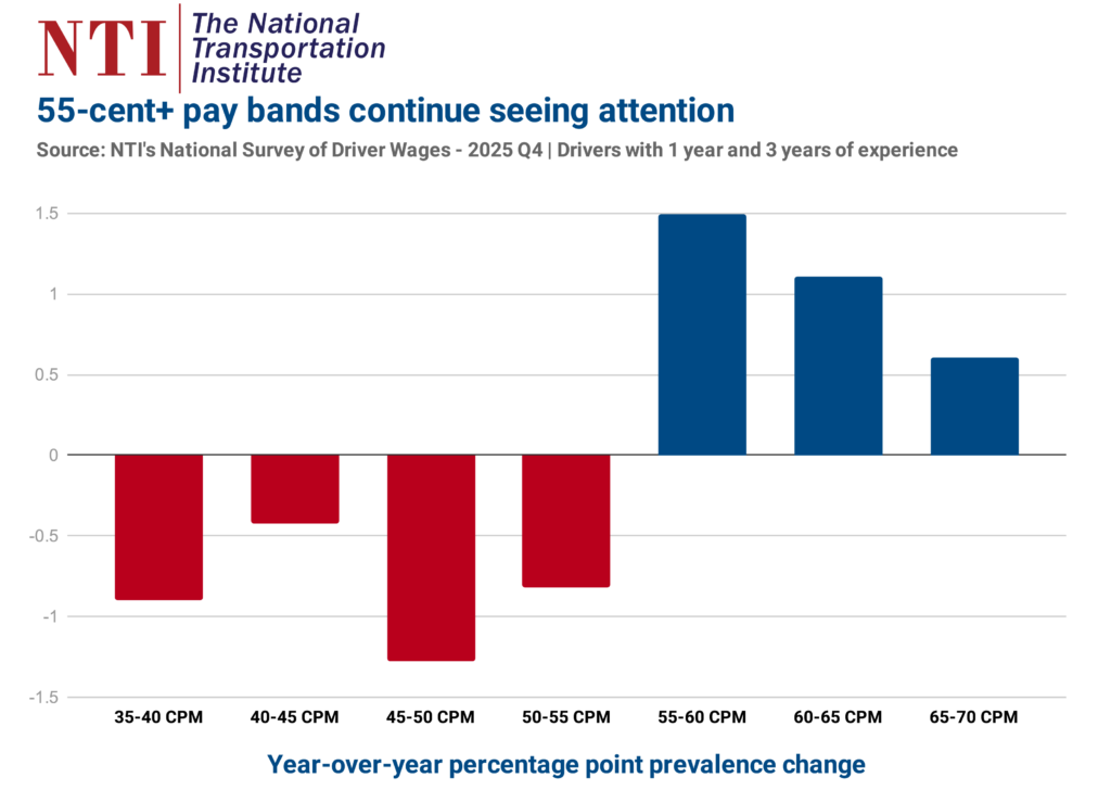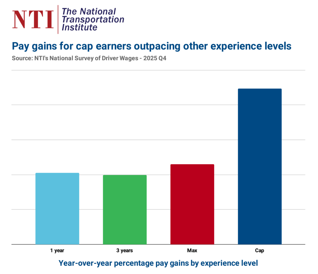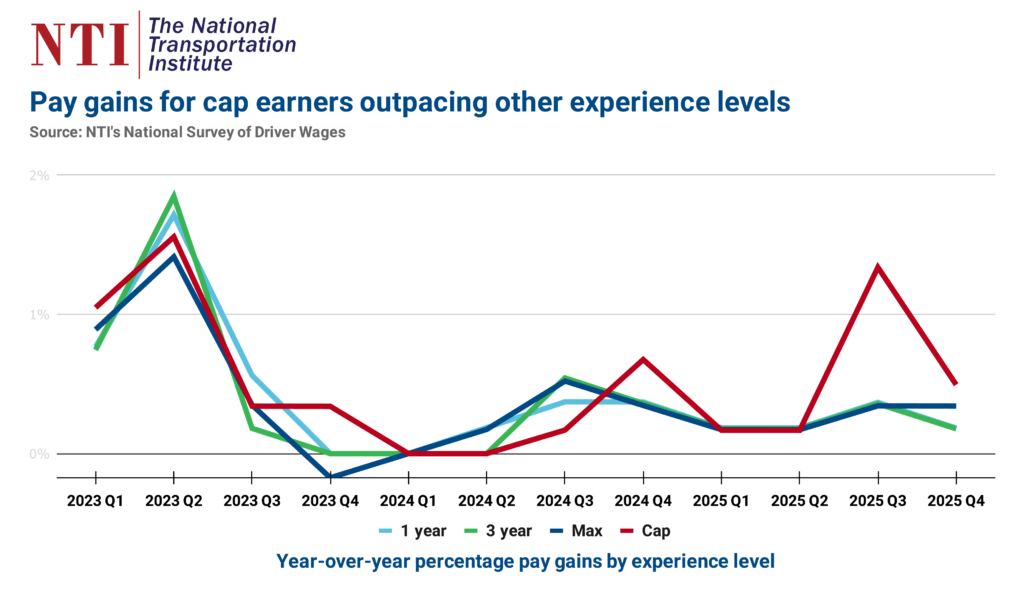 Per-mile base pay for those drivers has climbed upwards of 2 percent year over year in 2025’s fourth quarter — more than double that of drivers with one year of experience, three years of experience, and max experience (the starting pay for drivers with a few years of experience but who haven’t reached cap earner pay due to tenure).