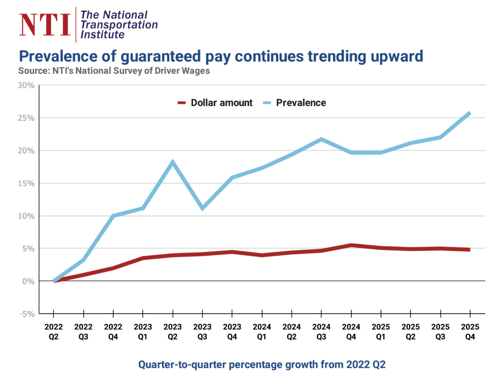 Prevalence of guaranteed pay programs, however, has seen momentum throughout 2025, as the chart above indicates. That includes a 4 percentage point gain this quarter alone, and growth of over 25% since mid-2022. We explored guaranteed pay and considerations your fleet should make when evaluating implementing this pay structure last month in the NTI Blog. Read it here