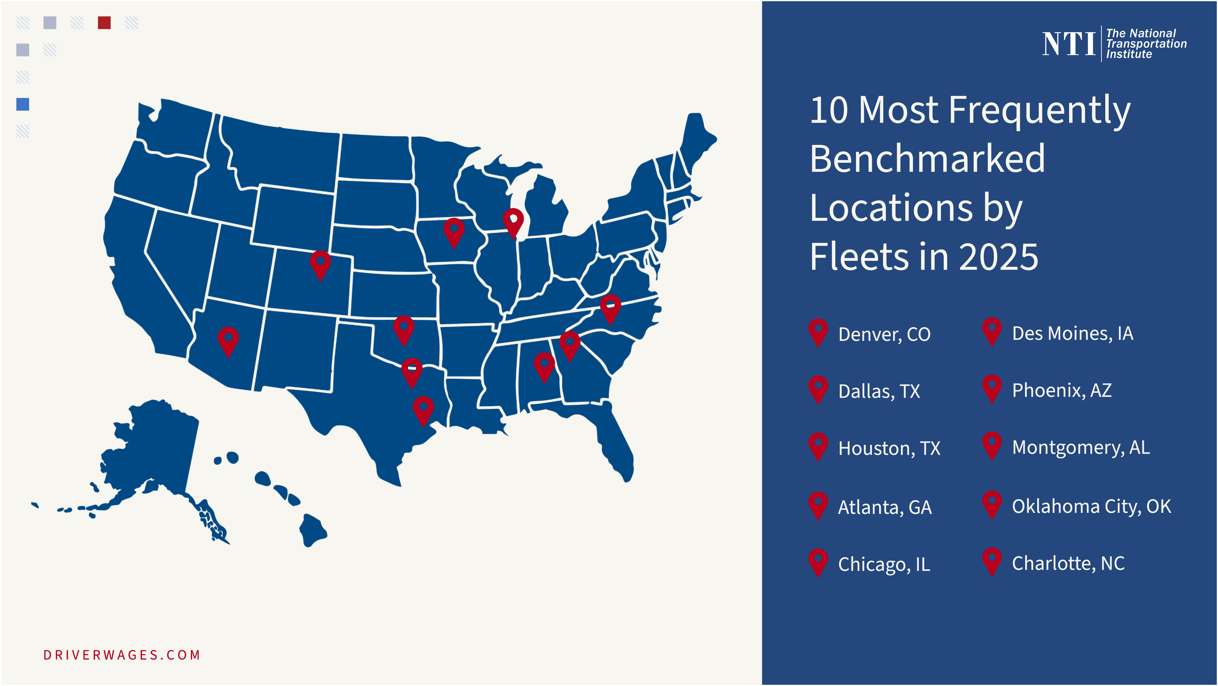 Here are the Top 10 locations year to date in 2025, according to NTI’s National City-Centric Driver Pay Survey, which reports mileage, hourly, and W2 pay at more than 800 locations nationwide: